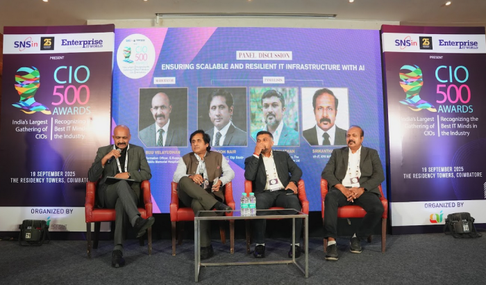 The first panel, on “Ensuring Scalable and Resilient IT Infrastructure with AI”, was moderated by Biju Velayudhan, CIO, G.Kuppuswamy Naidu Memorial Hospital, with panelists Subodh Nair (Elgi Equipments Ltd), Jidesh Gopinathan (The Arya Vaidya Pharmacy Coimbatore Ltd), and Srikanthan JS (KPR Mill Limited). The discussion emphasized how AI can help organizations build scalable systems while addressing resilience in increasingly volatile environments.