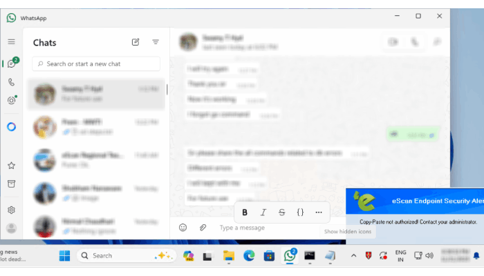 eScan’s technology works by monitoring data flow direction at both application and browser levels. Outbound transfers from enterprise systems to messaging apps are blocked, while inbound data remains accessible. It even prevents internal circulation within WhatsApp, addressing scenarios where employees might copy sensitive details between chats. Importantly, this control applies seamlessly across web and desktop versions, without disrupting user experience.